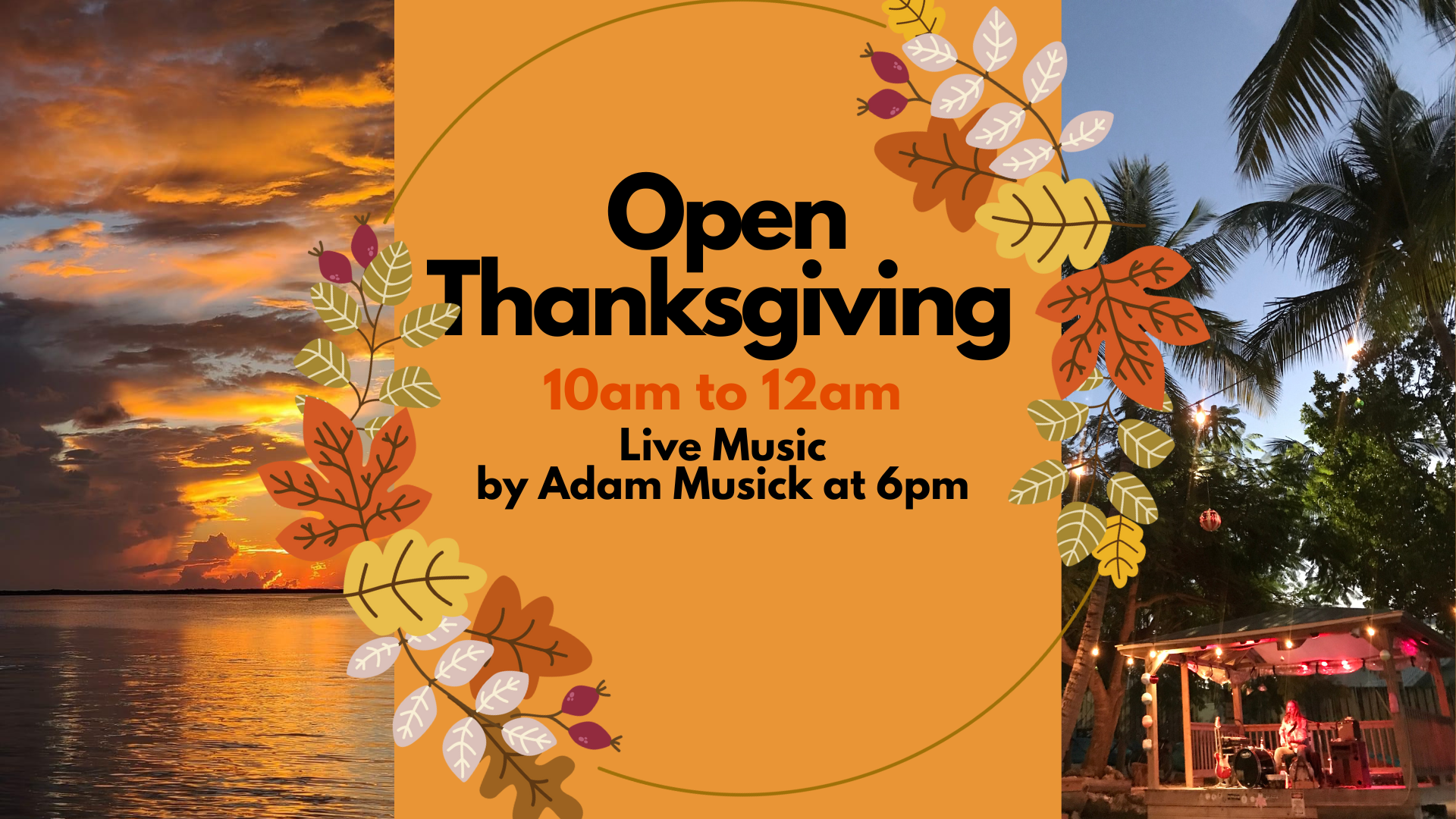 We are excited to be open Thanksgiving Day from 10am to midnight! Plus, we’ll have live music on our outdoor stage by Adam Musick from 6pm to 9pm. Come on up after your family meal to enjoy a gorgeous sunset on the bay and some excellent classic rock songs by Adam’s one man band!